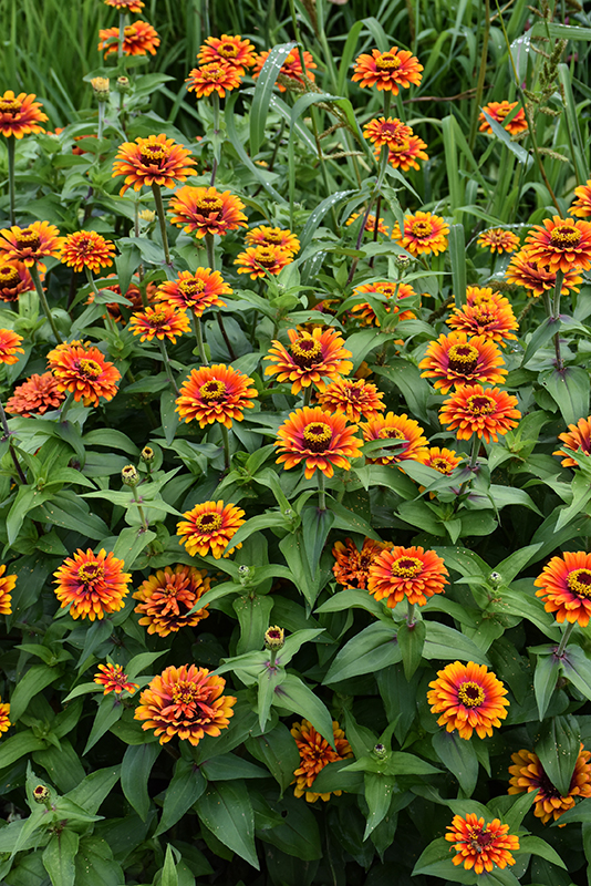 Zowie Yellow Flame Zinnia will grow to be about 26 inches tall at maturity, with a spread of 26 inches. When grown in masses or used as a bedding plant, individual plants should be spaced approximately 20 inches apart. Its foliage tends to remain dense right to the ground, not requiring facer plants in front. This fast-growing annual will normally live for one full growing season, needing replacement the following year.