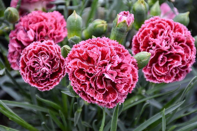 Fruit Punch® Cherry Vanilla Pinks has masses of beautiful fragrant double dark red frilly flowers with pink edges at the ends of the stems from late spring to mid summer, which are most effective when planted in groupings. The flowers are excellent for cutting. Its attractive narrow leaves remain grayish green in color throughout the year.